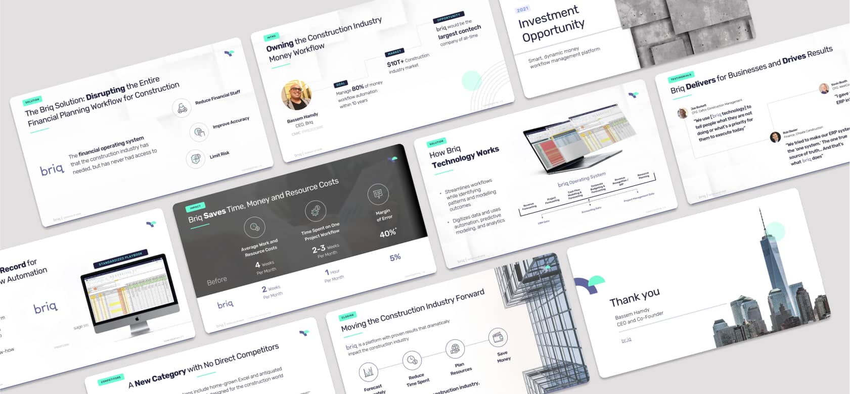 As part of the Creative Blue team, I designed a full suite of pitch and sales materials for Briq, an AI-driven financial automation platform transforming the construction industry. This included the company’s pitch deck, sales deck, platform overview, and additional investor materials used throughout their fundraising process. These assets played a key role in supporting Briq’s successful $30 million Series B funding round led by Tiger Global Management.
