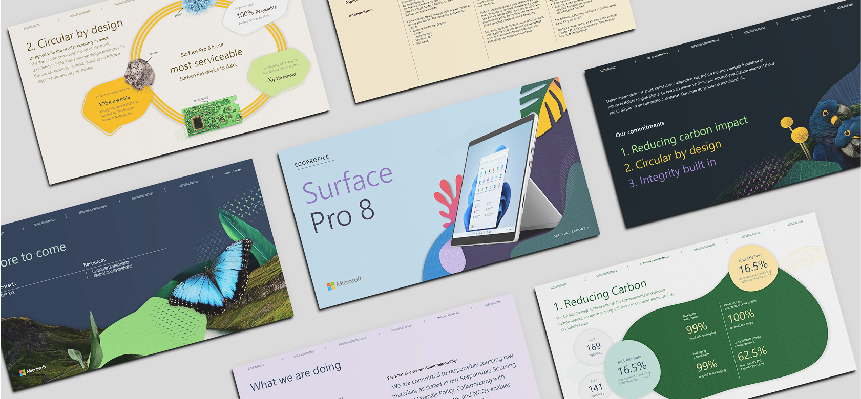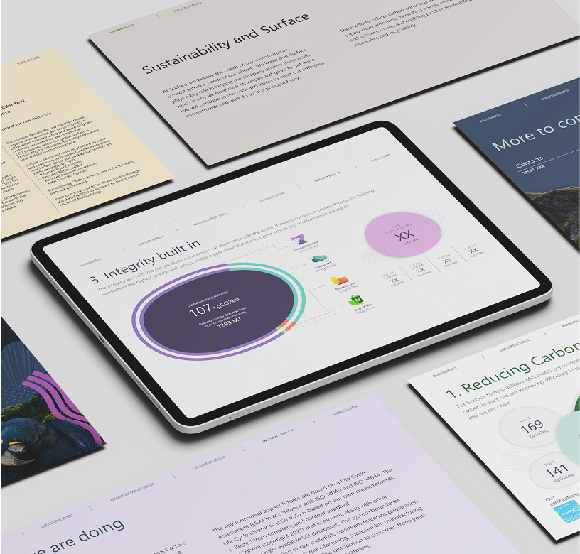 As part of the Monigle team, I worked with Microsoft’s internal brand team to design a flexible PowerPoint template system used to present Ecoprofiles for over 30 Surface and Xbox products. The system balanced clarity, accessibility, and sustainability storytelling — aligning with Microsoft's internal brand standards while allowing for product-specific customization. The final template supported consistent design expression across the series, making complex data both legible and visually engaging.