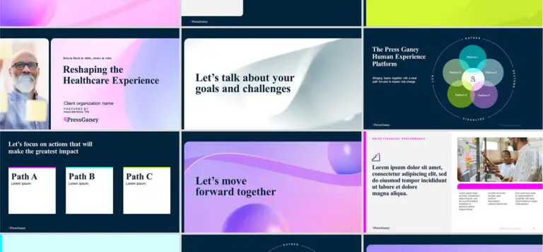 As part of the Monigle team, I collaborated with Press Ganey (NYSE: PGND), a publicly traded healthcare data analytics company, to design a visually engaging and effective sales deck that showcased their analytics solutions to potential clients. Utilizing compelling visuals and clear messaging, the presentation effectively communicated Press Ganey's value proposition. The redesigned deck now supports the company's 2,100 employees and $750 million in annual revenue, reinforcing its position as a trusted partner to over 41,000 healthcare provider organizations globally.
