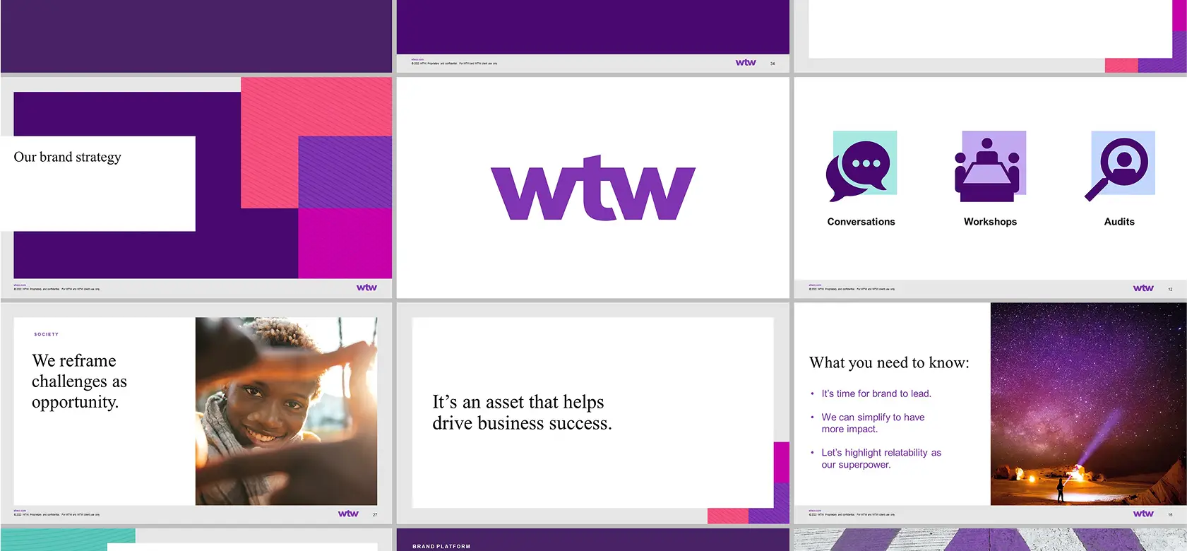 As part of the Monigle team, I supported the brand training and logo reveal for WTW (NASDAQ: WTW), a leading global consulting company. I contributed to the creation of interactive training modules designed to help over 40,000 employees understand and apply WTW’s new brand positioning, messaging, and visual system. The rebrand earned Gold at the Transform Awards for Best Visual Identity, celebrating the strength and creativity of the new WTW brand.